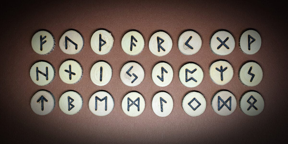 Gemeingermanische Runenreihe (älteres Futhark nach Vorbild des Kylversteins) auf Ahornholz. Das Set kann auf Wunsch mit Bienenwachs veredelt werden, durch das die Holzscheiben vor Umwelteinflüssen geschützt werden und eine – je nach Holz – leichte bis starke gold-gelbe Tönung erhalten, durch die die Maserung besonders schön zum Vorschein kommt.