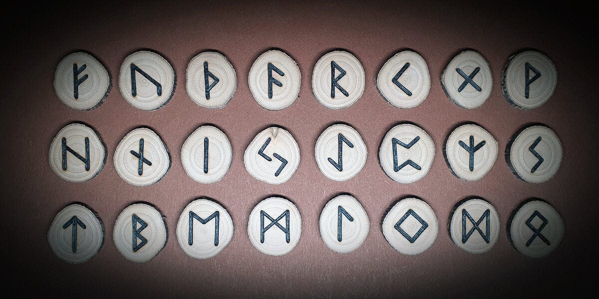 Gemeingermanische Runenreihe (älteres Futhark nach Vorbild des Kylversteins) auf Haselnussholz. Das Set kann auf Wunsch mit Bienenwachs veredelt werden, durch das die Holzscheiben vor Umwelteinflüssen geschützt werden und eine – je nach Holz – leichte bis starke gold-gelbe Tönung erhalten, durch die die Maserung besonders schön zum Vorschein kommt.