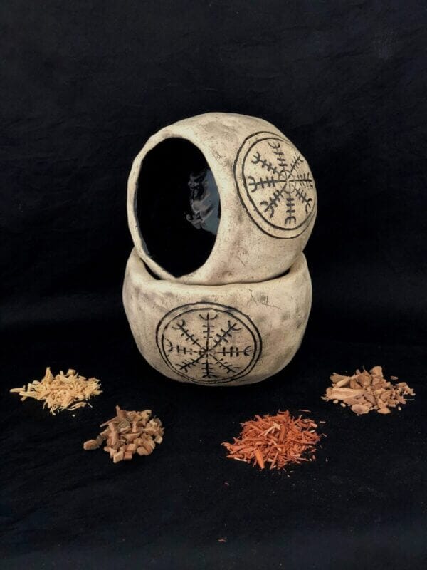 Wir haben unsere Räucherschale mit dem Helm des Aegir oder auch des Aegisjhalmur verziert. Aus Quellen wie beispielsweise der Eyrbyggja Saga und dem isländischen Brauchtum ist der Aegishjalmur auch als „runisches“ Zeichen bekannt. Seine Wirkung und seine Verwendung wird unterschiedlich beschrieben. Auch sind die mit ihm verbundenen Zeichen sehr unterschiedlich. Ein Zauberbuch schreibt ihm die Kraft zur Überwindung des Feindes zu, ein anderes, aufkommenden Streit zu besänftigen. Mit diesem Symbol möchten wir die magische Wirkung des Räucherns positiv verstärken.