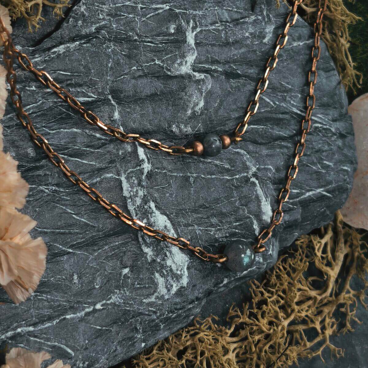 Elegante zweistrรคngige Halskette mit schimmernden Labradoritperlen an einer feinen goldfarbenen Messingkette. Die Perle liegt genau zwischen den Schlรผsselbeinen und setzt ein schรถnes extra Detail zu lรคngeren Ketten oder besticht durch schlichte Eleganz ohne weitere Ketten
