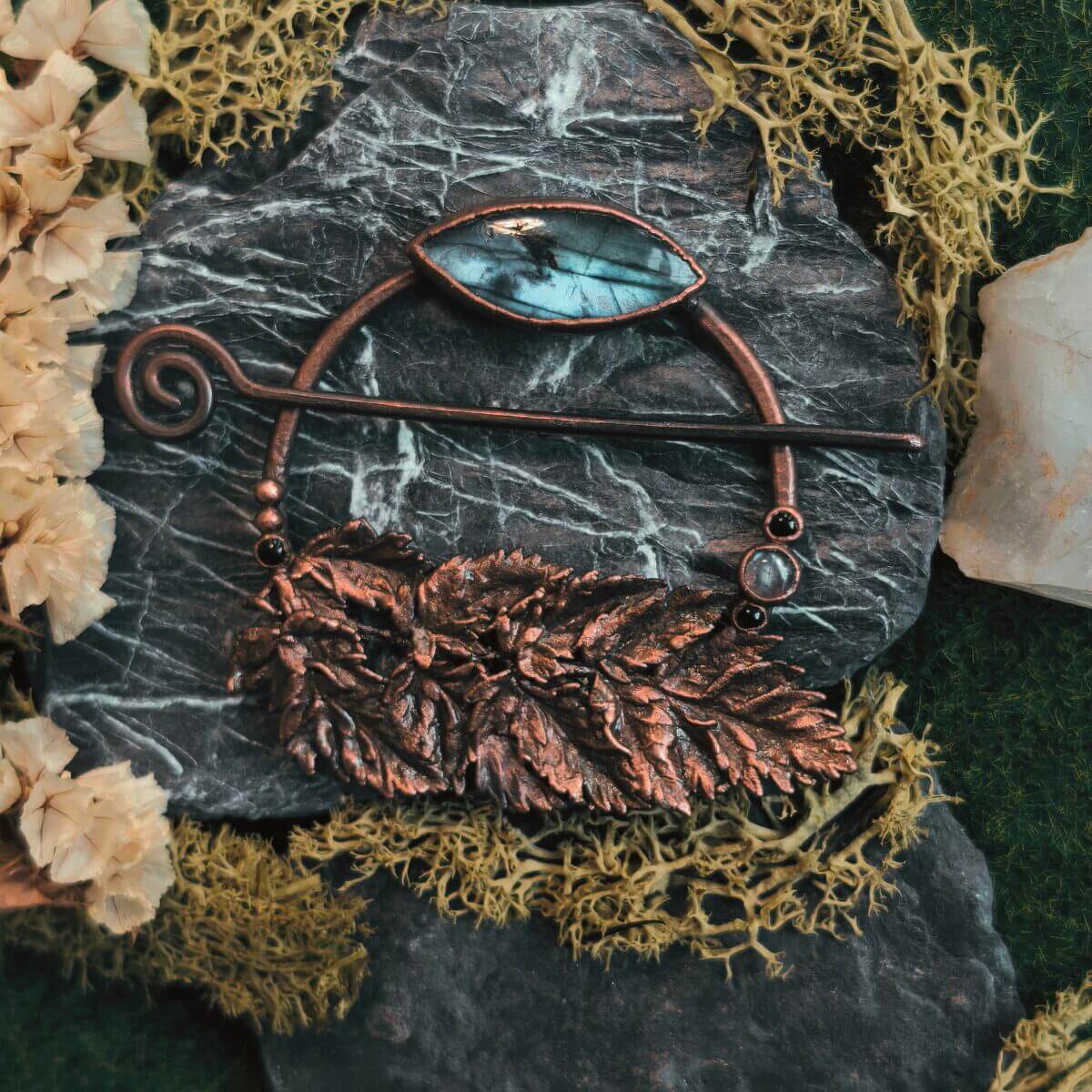 Diese handgemachte Fibel lรคsst sich sowohl als Haarspange, als auch als Brosche (v.a. fรผr gestrickte Kleidung) verwenden. Sie ist verziert mit einem echten verkupferten Farnblatt, zwei blauen Labradoriten und kleinen schwarzen Onyxen.