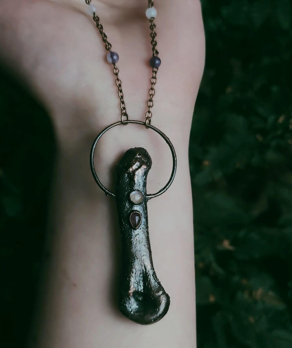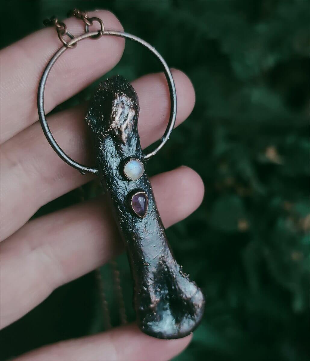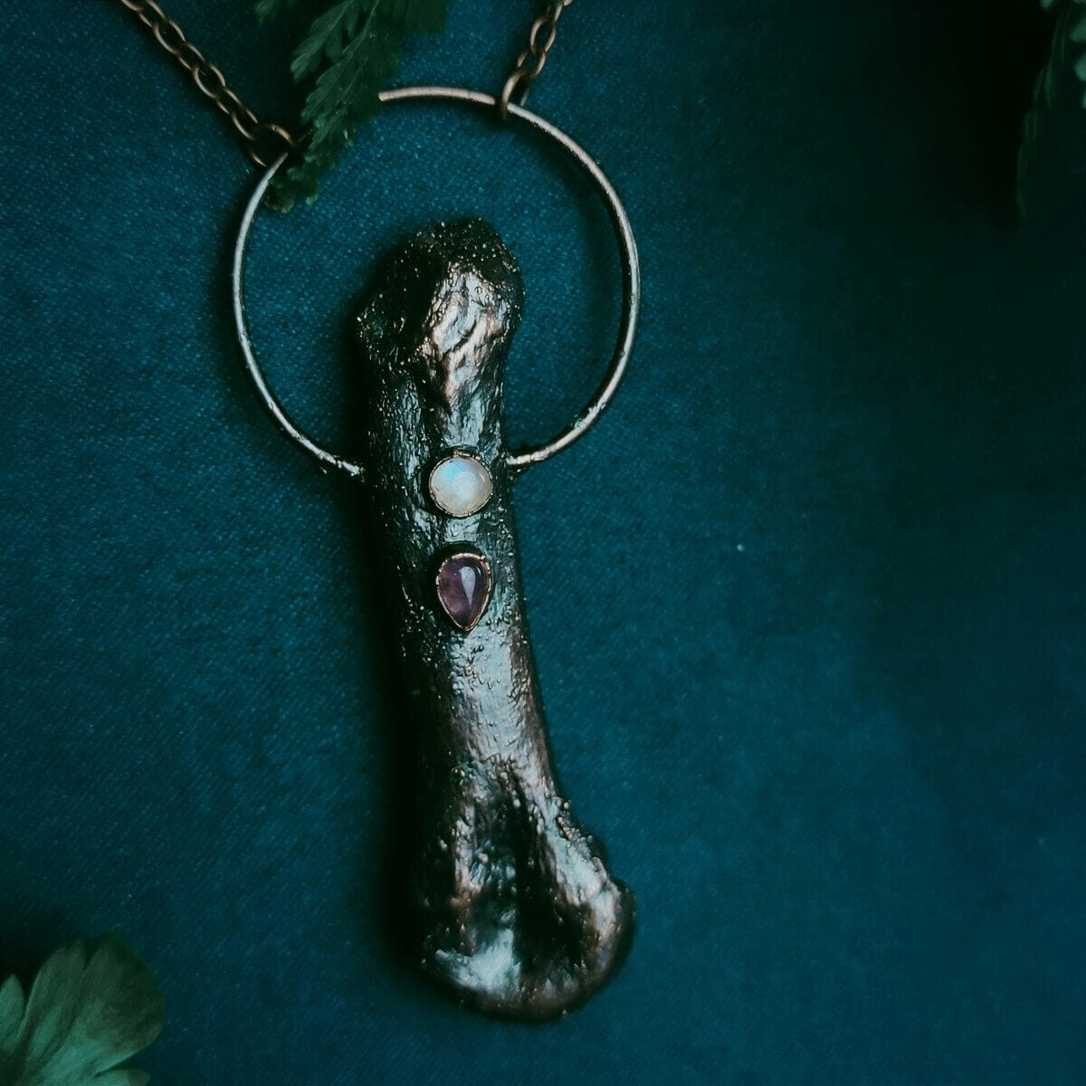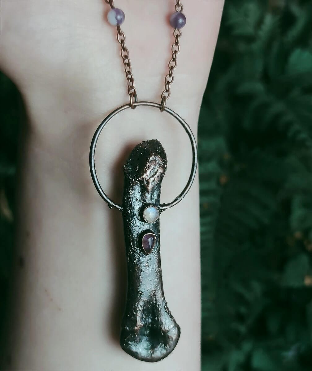 Handgefertigte Halskette aus einem echten verkupferten Rehknochen. Verziert mit einem Amethyst und einem kleinen Mondstein.