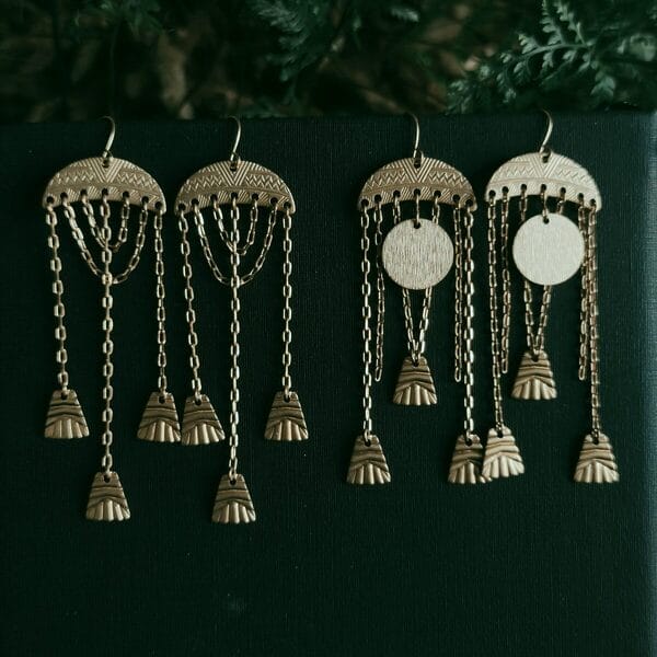 Lange goldfarbene Hängeohrringe aus Messing mit geometrischen Verzierungen, inspiriert von antiken Artifakten.