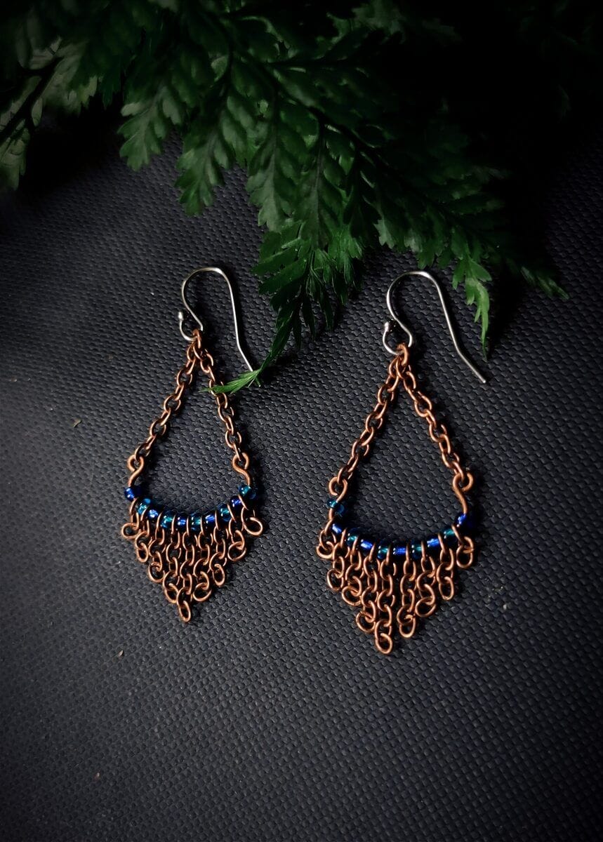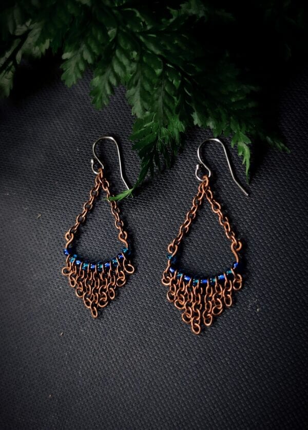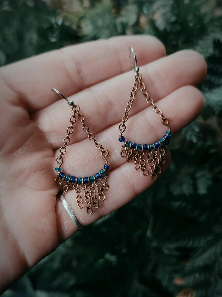 Handgemachte Ohrringe aus Kupfer und bunten Glasperlen in zwei verschiedenen Blautรถnen. Inspiriert von der Form der Drakkar – Drachenboote.