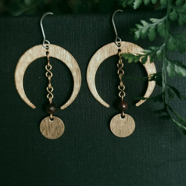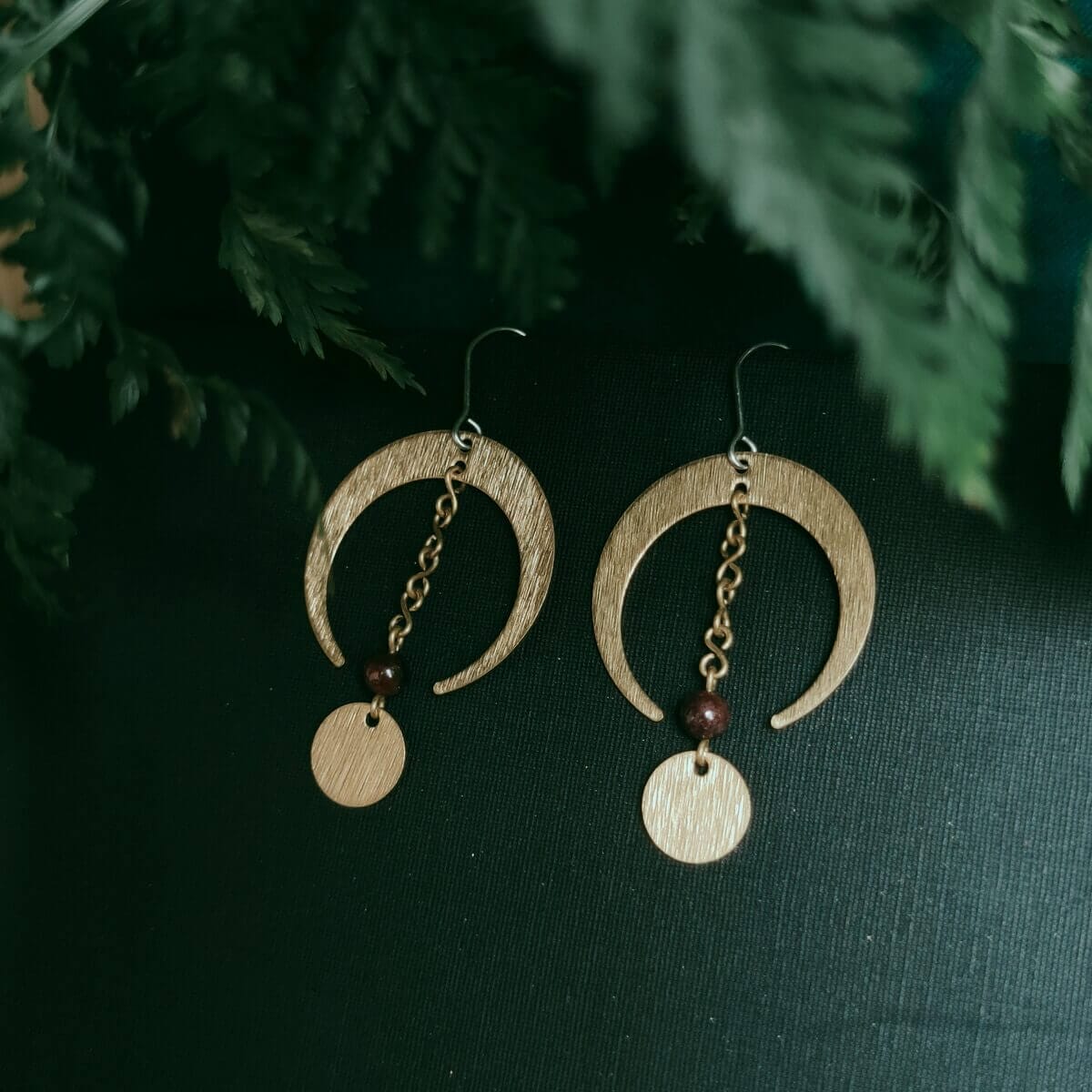 Goldfarbene Halbmond Hängeohrringe aus gebürsteten Messing, verziert mit dunkelroten Granatperlen.
