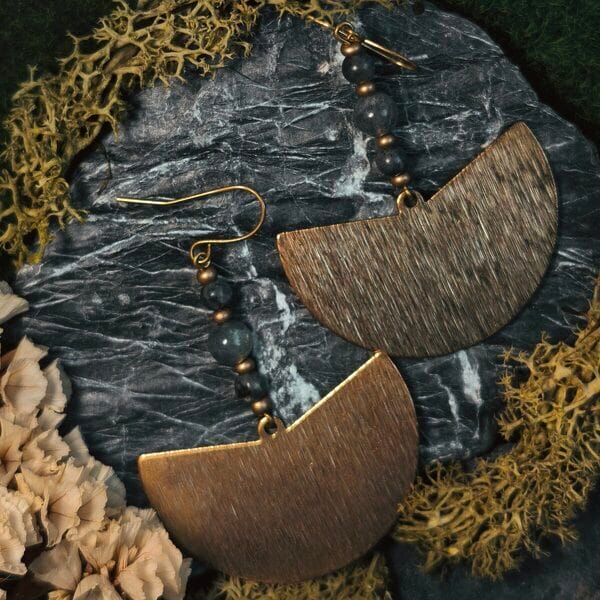 Handgefertigt aus gebürstetem Messing und verziert mit echten Labradoritperlen, erinnern diese Ohrhänger an Schmuckstücke aus der Antike. Die Kombination aus geometrischen Formen, schimmernden Halbedelsteinen und warmen Metalltönen verleiht ihnen eine ausdrucksstarke, historische Eleganz – perfekt für Liebhaber:innen von außergewöhnlichem Design mit archäologischem Flair.