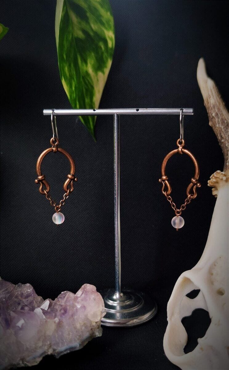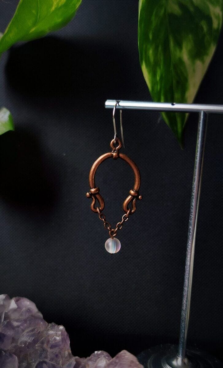 Elegante kupferfarbene Hรคngeohrringe mit schillernden Aurora Glasperlen. Inspiriert von keltischen Designs.